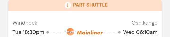 The route is a long-distance overnight journey. The main and most reliable bus service for the route from Windhoek to Oshikango (which is on the border with Angola) is Intercape & Marcon. The journey duration is approximately 11 hours to 12 hours. Busfare is between R500 to R700 one way.
