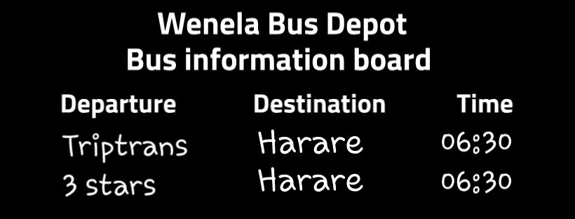 Bus schedule: There are only two bus operators available. 3 stars coaches from Blantyre to Harare is available on Thursdays and Sundays, from Harare to Blantyre is available on Wednesday and Saturday. Triptrans from Blantyre to Harare is available Monday to Saturday. From Harare to Blantyre is available Sunday to Friday.